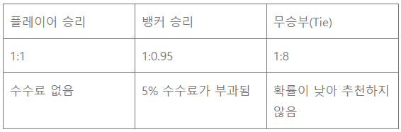 - 8,9 : Natural(플레이어와 뱅커 모두